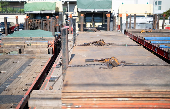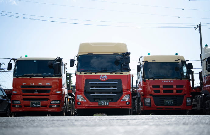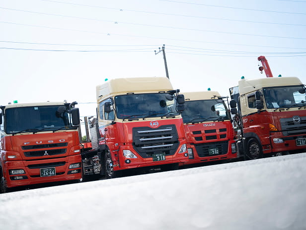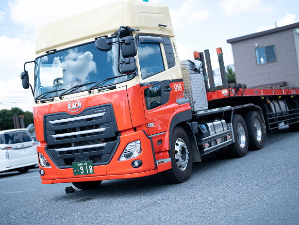 本社営業所は、ユニック車、トレーラー、クレーンなど、多種多様な車両を保有し、鉄骨・鉄板をはじめとする重量物の輸送を強みとしています。