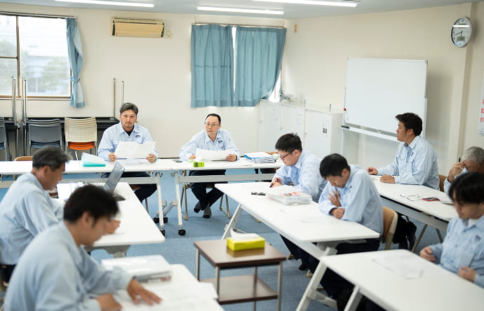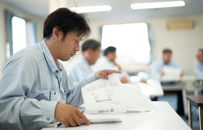 毎月開催される安全衛生及び班会議では、事故の事例を共有して安全への意識を高めています。